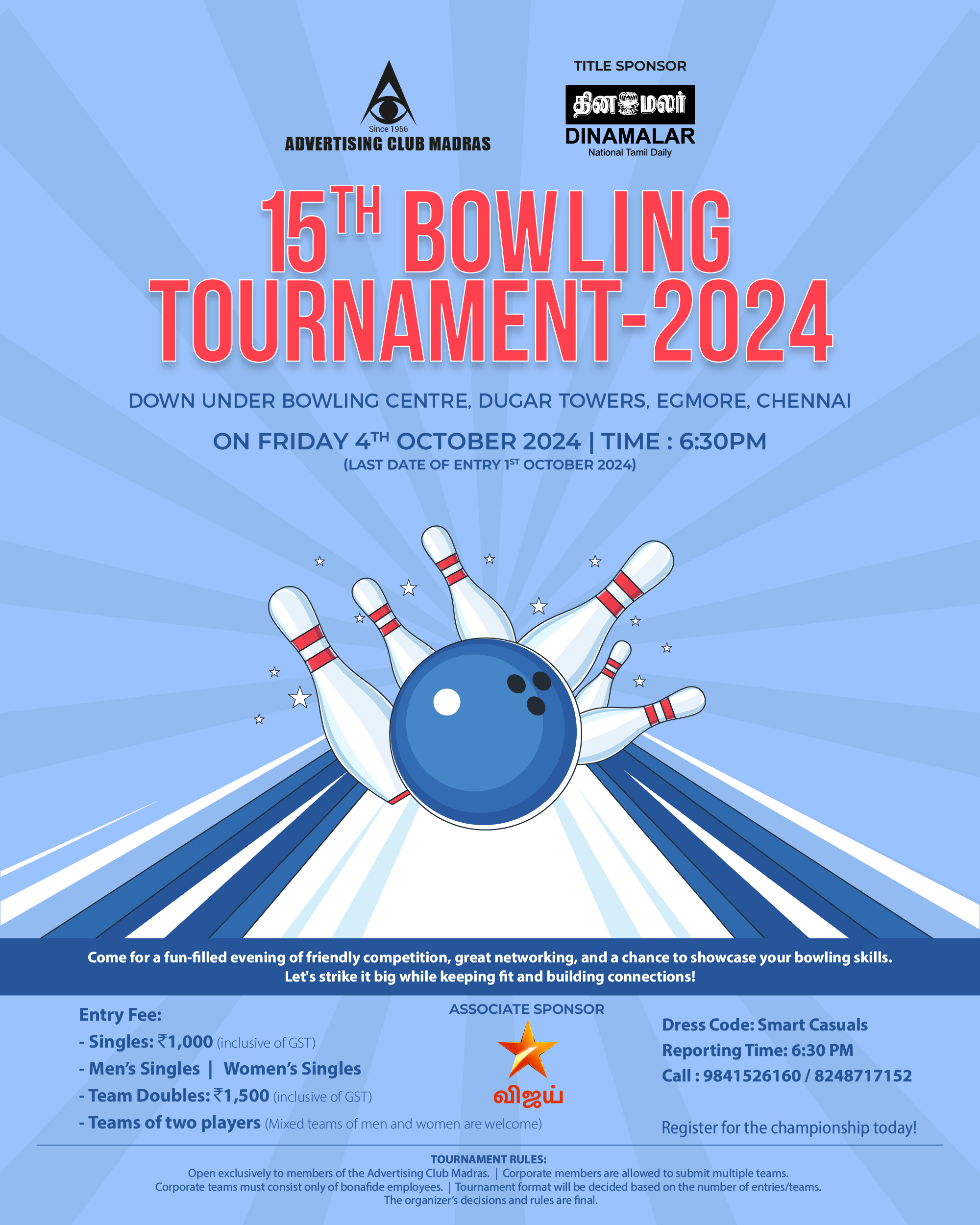 Singles Rs.1000 (inclusive of GST) Team Doubles Rs.1500 (inclusive of GST)